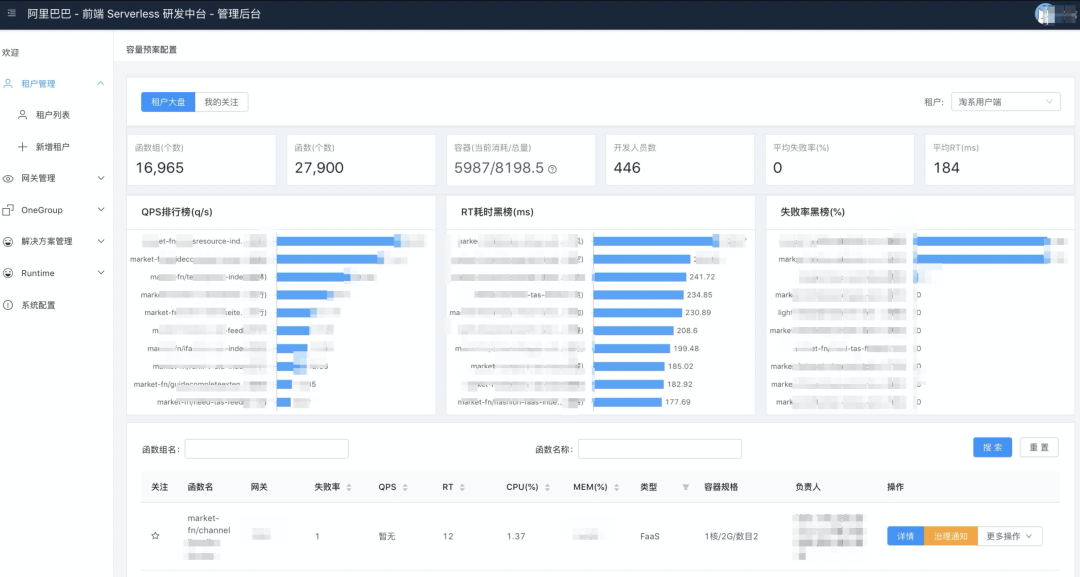 平台上的每个租户都有对应的租户管理员,对各自租户的函数稳定性负责,包括租户下函数的单元化部署规则、大促管控、自建网关配置、容器额度、租户私有解决方案等,为此平台提供了一系列运维工具。