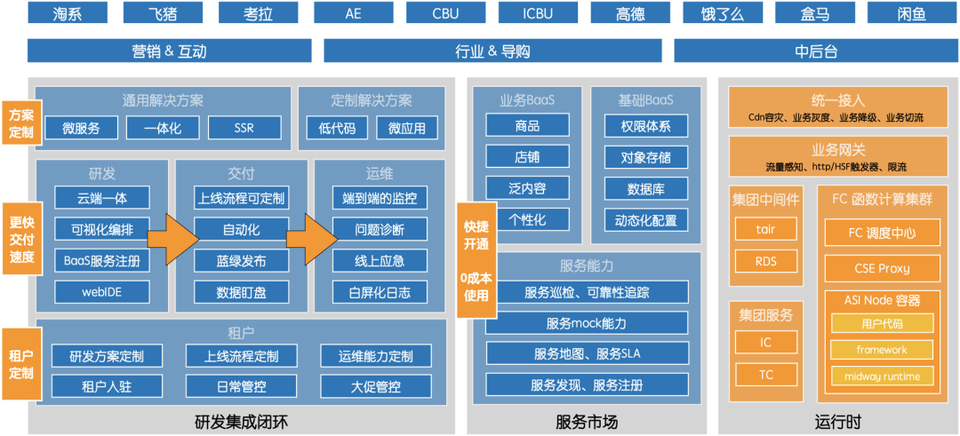 Serverless 云研发平台作为阿里巴巴集团前端委员会发起的一体化云研发平台,底层基于函数计算 FC,是整个 Node Serverless 体系中的研发入口,承接了淘宝、飞猪、ICBU、考拉、高德、文娱等研发、交付和运维工作。目前,集团已经有上千位前端和客户端的工程师使用 Serverless 云研发平台进行业务的开发工作,包括但不限于营销导购、中后台、行业前台等规模化场景。