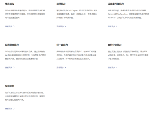 我们在华为的开发平台上可以看到一些 kit 和鸿蒙有关的有设备虚拟化、HiCar、HiLink、碰一碰等。