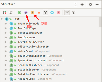 我们可以点击DevEco界面左侧选项卡Structure查看类中详细结构,我们可以看到Text自身提供了很多属性和方法,同时也继承父类的很多属性和方法。