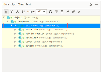 文本组件是我们最常用的组件之一,它是用来在UI界面上显示字符串。作为基本组件,有很多扩展,常见的有按钮组件Button、文本编辑组件TextFiled、计时器组件TickTimer,它们都是Text组件的扩展(也称为Text的子类)。 Text(文本组件)是Component类的子类之一,所以它能够使用Component类的所有公开的属性和方法(后面章节会详细介绍该类),Text类自身也提供了一些特殊的属性、方法、内部类和接口。 1、从源代码入手 阅读官方的Java API文档看结构不是很清晰,所以我们在DevEco中查看源代码。