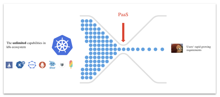 而这里的关键点在于,上述这些能力在 Kubernetes 生态中都是非常常见的的能力,有的甚至是 Kubernetes 内置就可以支持。可是到了 PaaS 这里,要支持上述任何一个能力,都必须对 PaaS 进行一轮开发,而且由于先前的一些假设和设计,甚至很可能需要大规模的重构。