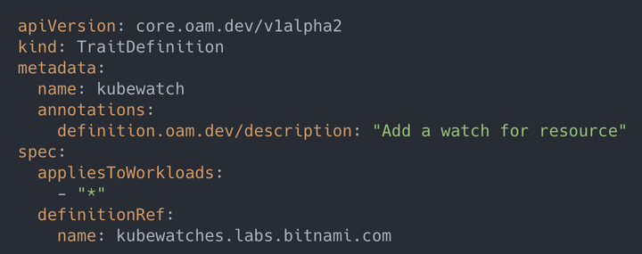 而 KubeWatch 作为一种告警机制,自然作为 Trait 来使用的。这时候,我们就可以通过写一个 TraitDefinition yaml 来将它注册: