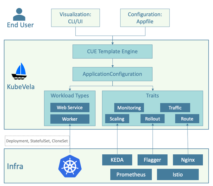 在架构上,KubeVela 只有一个 controller 并且以插件的方式运行在 Kubernetes 之上,为 Kubernetes 带来了面向应用层的抽象,以及以此为基础的面向用户的使用界面,即Appfile。Appfile 乃至 KubeVela 运行机制背后的核心,则是其能力管理模型 Open Application Model (OAM) 。基于这个模型,KubeVela 为系统管理员提供了一套基于注册与自发现的能力装配流程,来接入 Kubernetes 生态中的任意能力到 KubeVela 中,从而以“一套核心框架搭配不同能力”的方式,适配各种使用场景(比如 AI PaaS,数据库 PaaS 等等)。
