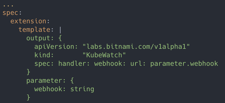 实际上,大多数社区能力虽然很强大,但对于最终用户来都比较复杂,学习和上手非常困难。所以在 KubeVela 中,它允许平台管理员对能力做进一步封装以便对用户暴露简单易用的使用接口,在绝大多数场景下,这些使用接口往往只有几个参数就足够了。在能力封装这一步,KubeVela 选择了 CUE 模板语言,来连接用户界面和后端能力对象,并且天然就支持完全动态的模板绑定(即变更模板不需要重启或者重新部署系统)。下面就是 KubeWatch Trait 的模板例子: