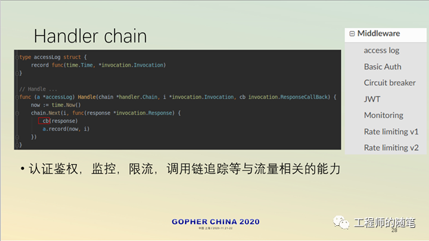 可以看下现在已经支持的中间件,无论限流,熔断,负载均衡,认证鉴权,审计,我们都用此机制实现:将公司全部的工具链,服务治理手段,安全合规等都落入到处理链中,可快速加快研发速度,并统一规范,减少管理负担。