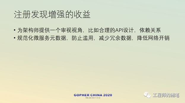 总结:我们通过了多种手段来提升微服务研发效率,减少网络开销,并通过异步缓存提升性能和可靠性,这是我们在这个服务上积累下来的能力。使得注册发现这个组件对技术管理者变得更加友好,可以帮助架构师持续改进并管理架构。然而云应用远远不止交付业务功能这么简单。