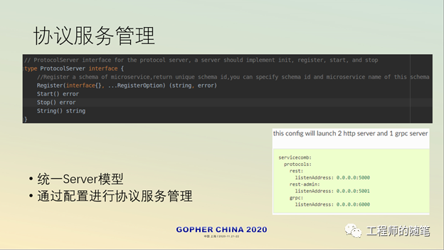 这个 protocol server 通常代表一个协议,也可以是某种编程模型,比如 http,编程模型如beego,gin这有个框架的配置样例,意思是在一个微服务进程中拉起了 2 个http 端口和 grpc 端口服务