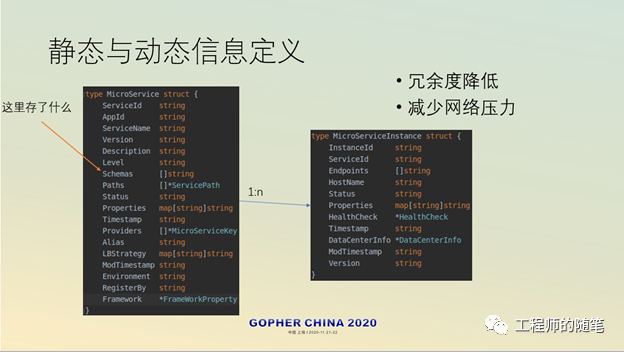 为了减少数据信息量,抽出公共部分统一进行管理,通过静态信息来划分实例归属。所以微服务与微服务实例为 1 对n 的映射,将微服务名,版本,描述等信息都抽到了公共部分,通过降低冗余度,来减少网络的开销,这样比如“描述“这样的信息就不在网络中传递,同时又能兼顾微服务管理能力,规范化了微服务模型。比如一个微服务必须具备版本信息。而真正下发到微服务缓存中的实例信息就少多了,许多字段是给人类看到,并非机器执行所需要的。