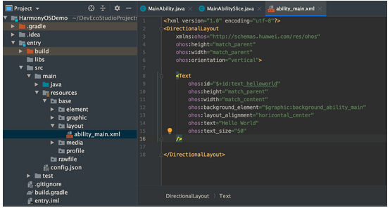 进入界面后,默认的IDE已经创建了一个hello world程序,我们打开entry -> src -> main ->resources -> base -> layout -> ability_main.xml 布局文件: