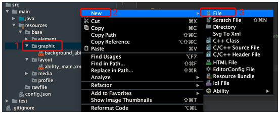 按钮的背景指定了“button_element”来显示,这是另外一个布局文件,我们来手动创建,在resources -> base ->graphic 目录下,右键创建一个File,命名为:button_element.xml