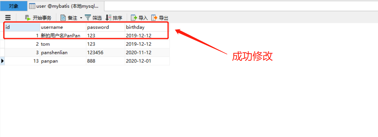 执行结果如下,成功修改 id =1 的数据记录,新用户名为 新的用户名PanPan
