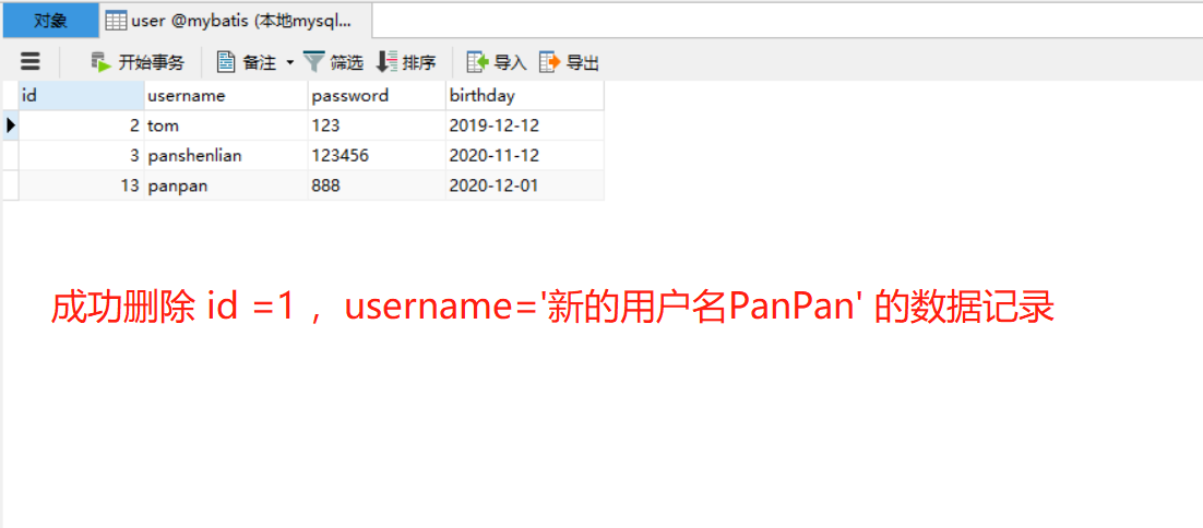 执行结果如下,成功删除 id =1 ,username=新的用户名PanPan的数据记录。