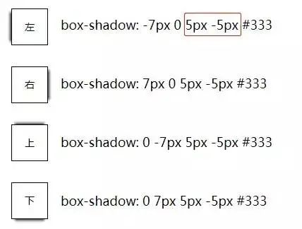 以 box-shadow:1px2px3px4px#333 为例,4 个数值的含义分别是,x 方向偏移值、y 方向偏移值 、模糊半径、扩张半径。