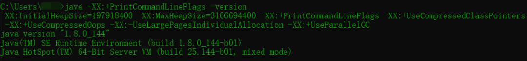 -XX:InitialHeapSize=197918400 -XX:MaxHeapSize=3166694400 -XX:+PrintCommandLineFlags -XX:+UseCompressedClassPointers -XX:+UseCompressedOops -XX:-UseLargePagesIndividualAllocation -XX:+UseParallelGC