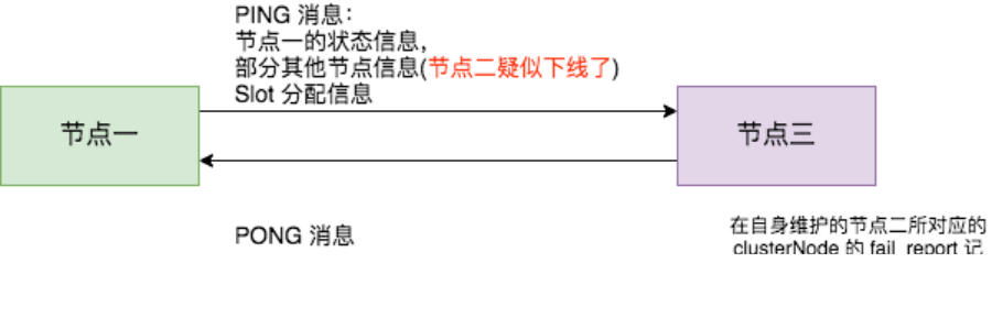 然后,节点一会通过 PING 消息,将节点二处于疑似下线状态的信息传递给其他节点,例如节点三。节点三接收到节点一的 PING 消息得知节点二进入 PFAIL 状态后,会在自己维护的 clusterState 的 nodes 字典中找到节点二所对应的 clusterNode 结构,并将主节点一的下线报告添加到 clusterNode 结构的 fail_reports 链表中。