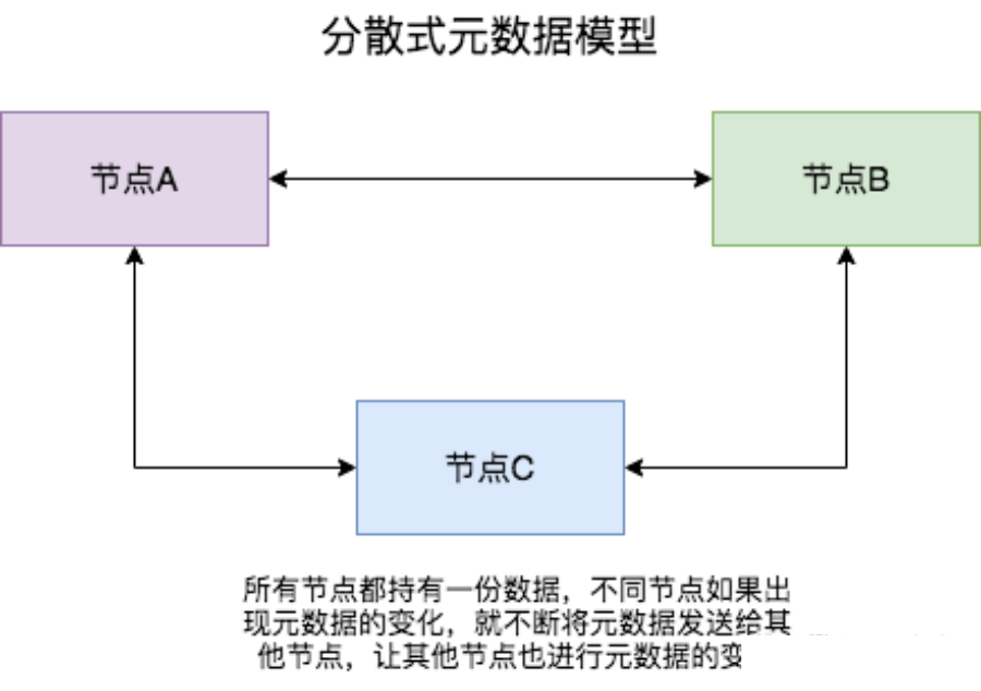| 分散式 | 数据更新压力分散,元数据的更新比较分散,不是集中某一个节点,更新请求比较分散,而且有不同节点处理,有一定的延时,降低了并发压力 | 数据更新延迟,可能导致集群的感知有一定的滞后 |