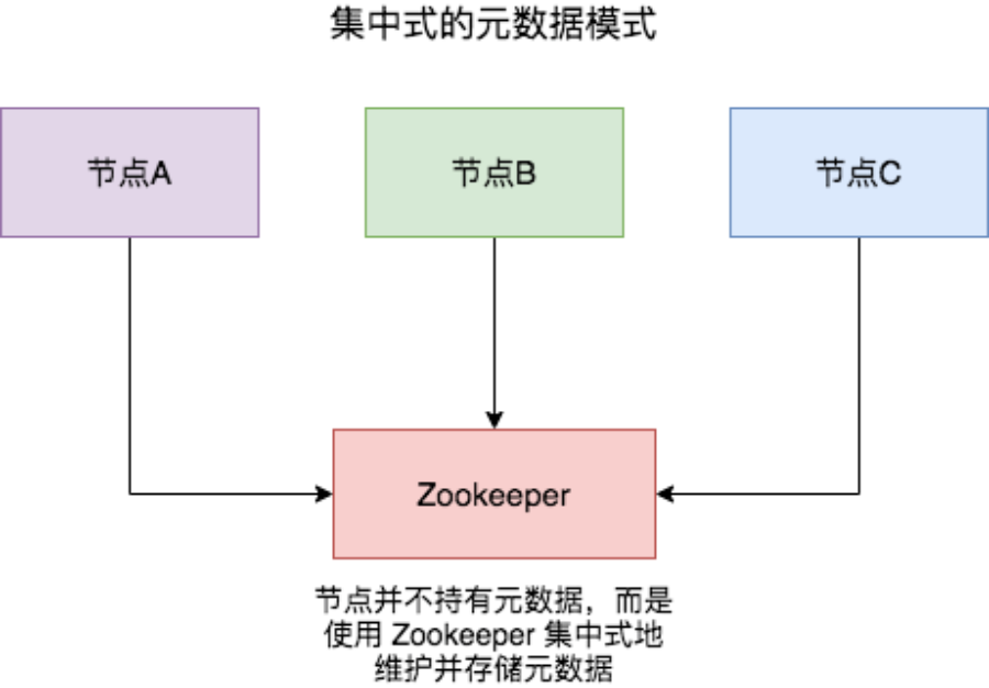 | 集中式 | 数据更新及时,时效好,元数据的更新和读取,时效性非常好,一旦元数据出现了变更,立即就更新到集中式的外部节点中,其他节点读取的时候立即就可以感知到; | 较大数据更新压力,更新压力全部集中在外部节点,作为单点影响整个系统 |