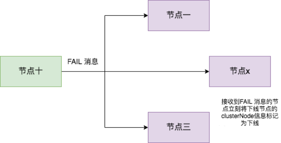 随着时间的推移,如果节点十 (举个例子) 也因为 PONG 超时而认为节点二疑似下线了,并且发现自己维护的节点二的 clusterNode 的 fail_reports 中有半数以上的主节点数量的未过时的将节点二标记为 PFAIL 状态报告日志,那么节点十将会把节点二将被标记为已下线 FAIL 状态,并且节点十会立刻向集群其他节点广播主节点二已经下线的 FAIL 消息,所有收到 FAIL 消息的节点都会立即将节点二状态标记为已下线。如下图所示。