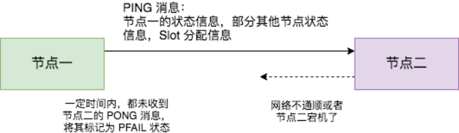 Redis Cluster 中的节点会定期检查已经发送 PING 消息的接收方节点是否在规定时间 ( cluster-node-timeout ) 内返回了 PONG 消息,如果没有则会将其标记为疑似下线状态,也就是 PFAIL 状态,如下图所示。