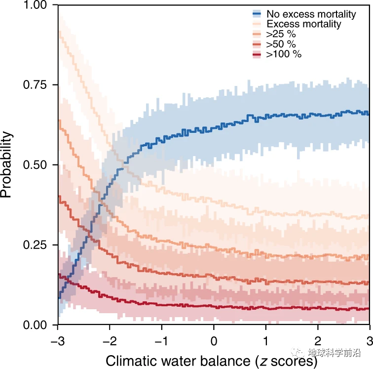 图1. 不同水分平衡条件下欧洲地区森林死亡的概率