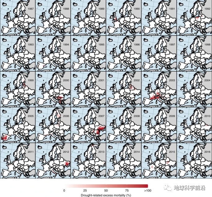 作者进一步分析了1987~2016年欧洲地区森林死亡的主要区域。结果表明干旱导致的森林死亡主要分布在:1992年中欧、1994年西班牙、1999年和2002年波罗的海国家、2000年东南欧、2003年中欧和西欧、2005年伊比利亚半岛、2006年中欧和芬兰、2007年和2012年东南欧和东欧等地区。