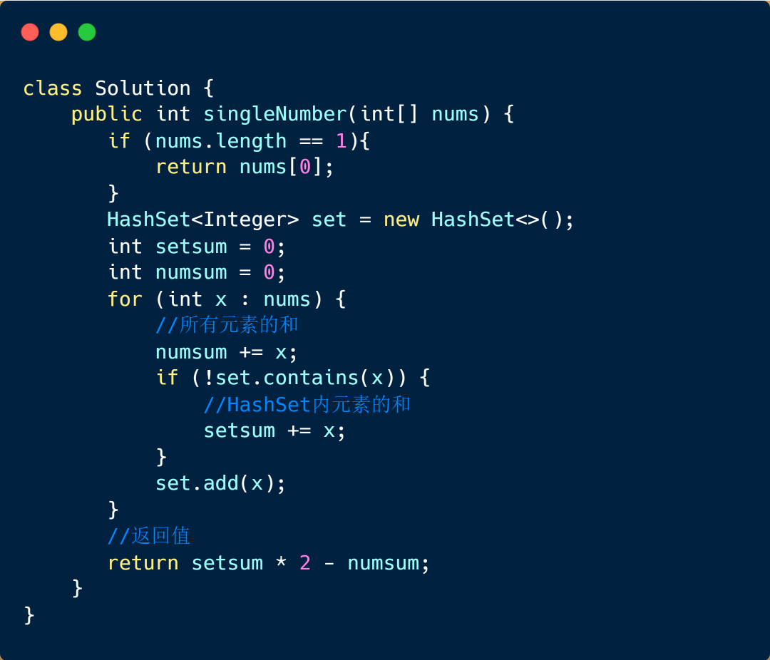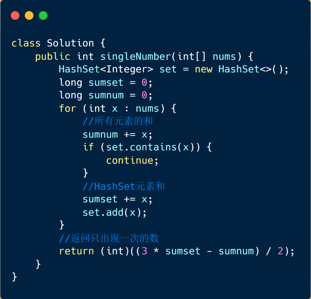 这个方法也比较简单,也是借助咱们的 HashSet 具体思路如下,我们通过 HashSet 保存数组内的元素,然后进行求和(setsum),那么得到的这个和则为去除掉重复元素的和,我们也可以得到所有元素和(numsum)。因为我们其他元素都出现两次,仅有一个元素出现一次,那我们通过 setsum * 2 - numsum 得到的元素则为出现一次的数。