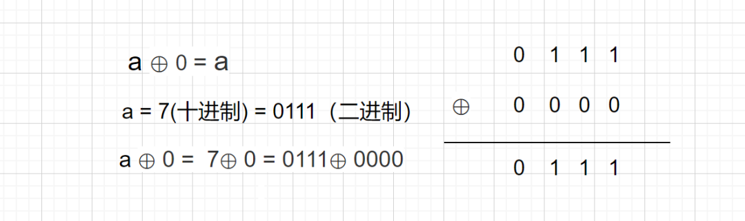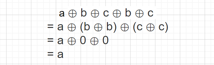我们通过上面的例子了解了异或运算,对应位相异时得 1,相同时得 0,那么某个数跟本身异或时,因为对应位都相同所以结果为 0 , 然后异或又满足交换律和结合律。则