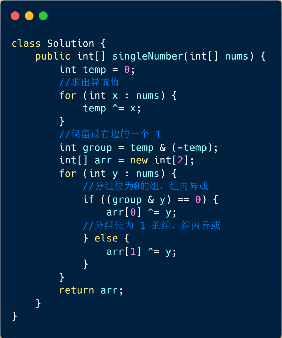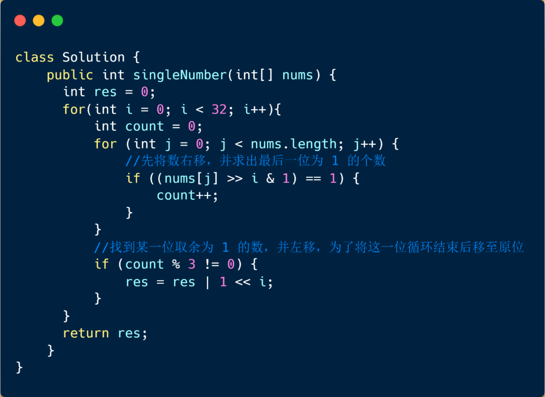 这个题目用 HashMap 和排序查找肯定也是可以的,大家可以自己写一下,另外我们在第一题中有个利用异或求解的方法,但是这个题目是出现三次,我们则不能利用直接异或来求解,那还有其他方法吗?