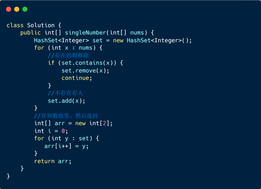 这个做法和我们第一题的做法一致,只要理解了第一题的做法,这个很容易就能写出来,有一点不同的是,第一题的 HashSet 里面最后保留了一个元素,该题保留两个元素。