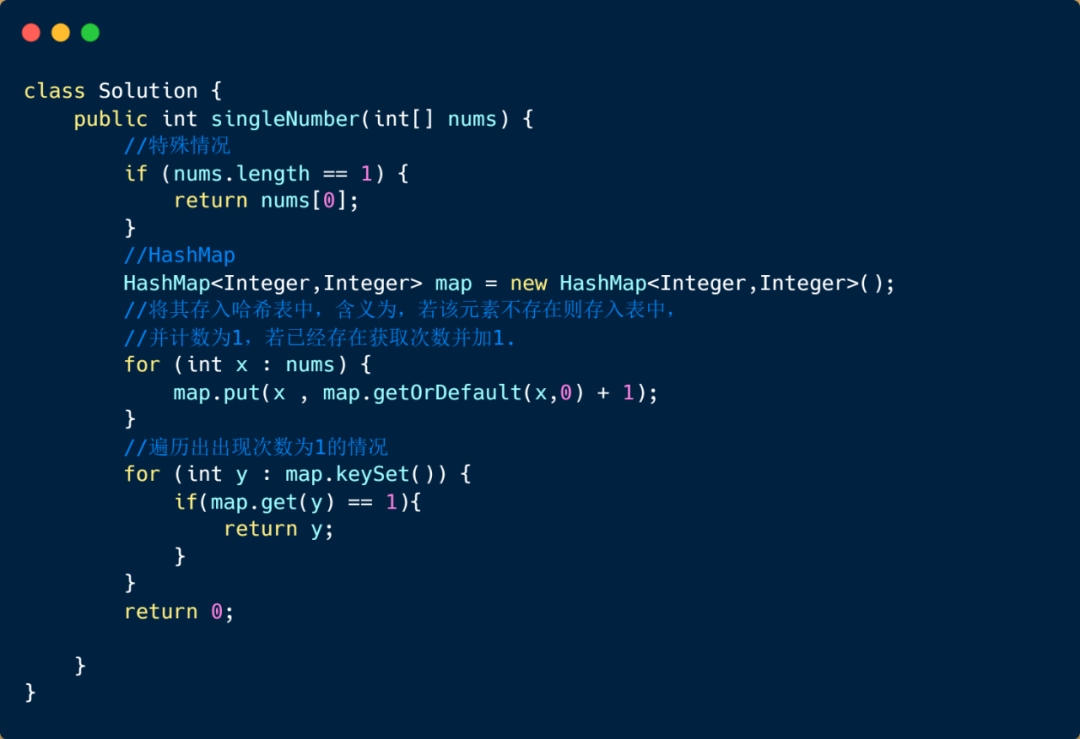 用 HashMap 的这个方法是很容易实现的,题目要求不是让我们求次数嘛,那我们直接遍历数组将每个数字和其出现的次数存到哈希表里就可以了,然后我们再从哈希表里找出出现一次的那个数返回即可。