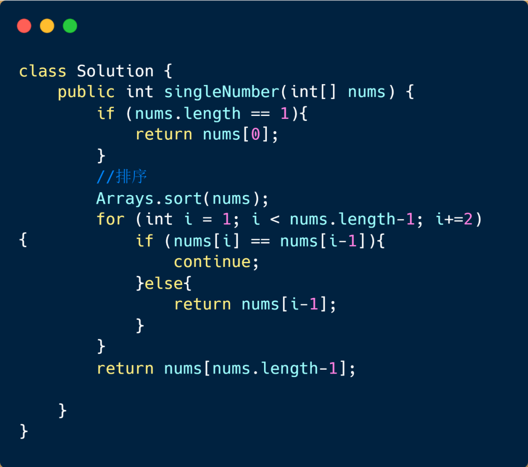 这个方法也是特别容易想到的,我们首先对数组进行排序,然后遍历数组,因为数组中其他数字都出现两次,只有目标值出现一次,所以则让我们的指针每次跳两步,当发现当前值和前一位不一样的情况时,返回前一位即可,当然我们需要考虑这种情况,当我们的目标值出现在数组最后一位的情况,所以当数组遍历结束后没有返回值,则我们需要返回数组最后一位,下面我们看一下动图解析。