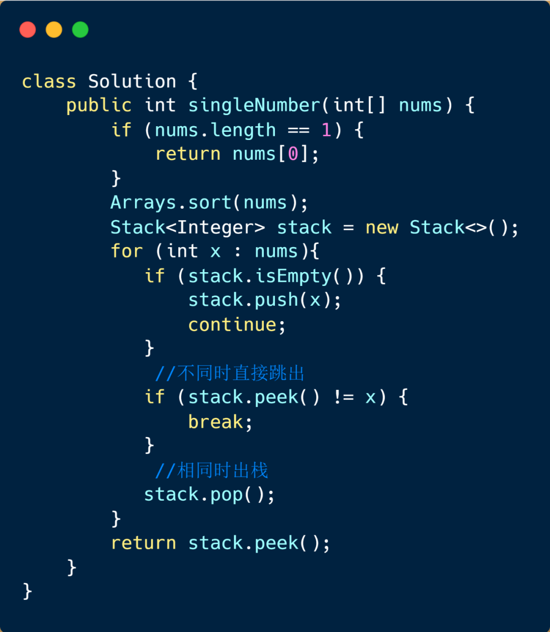 该方法也很容易想到,我们首先将其排序,然后遍历数组,如果栈为空则将当前元素压入栈,如果栈不为空,若当前元素和栈顶元素相同则出栈,继续遍历下一元素,如果当前元素和栈顶元素不同的话,则说明栈顶元素是只出现一次的元素,我们将其返回即可。这个题目也可以使用队列做,思路一致,我们就不在这里说明啦。下面我们看下动图解析。
