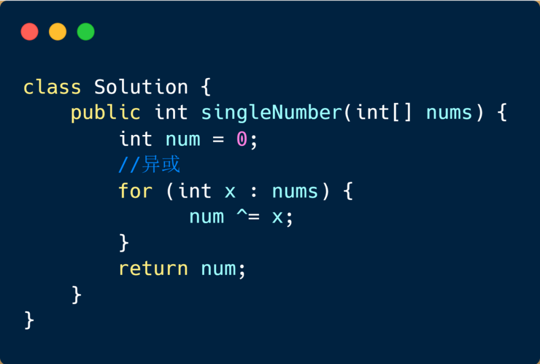给定一个非空整数数组,除了某个元素只出现一次以外,其余每个元素均出现两次。找出那个只出现了一次的元素。