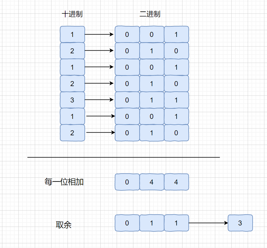 这个方法主要做法是将我们的数的二进制位每一位相加,然后对其每一位的和取余 ,我们看下面的例子。