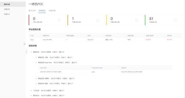 如下图是本地对云平台的应用和硬件进行的监控,保证问题和异常的有效和及时发现,并且将告警数据上传到远程运维服务中心进行展示;通过定期巡检功能对云平台进行基础的环境和服务巡检,云产品的巡检、资源的容量以及性能的巡检,对于其业务正常与否与健康程度进行了数据化评价和判定,并将生成报告上传到远程运维中心进行展示。