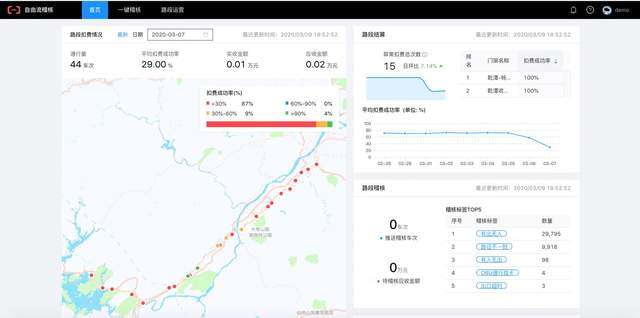 通过AI算法和大数据技术,提供标签与嫌疑车辆圈选,在海量的数据中自动识别通行异常的车辆并推送给稽核人员,当日稽核数据的基础情况在关键指标区域可见(通行量、平均扣费成功率、实收金额、应收金额及稽核标签)。