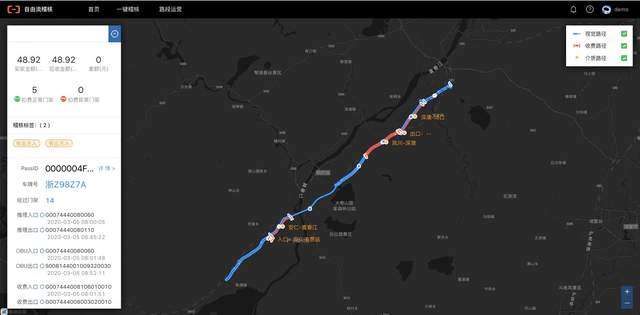识别出来的通行车辆异常包含通行扣费异常和通行行为异常,稽核人员可以根据标签和金额,或稽核置信度来筛选优先需要稽核的车辆,比如选取最高嫌疑选项,查询车辆异常通行对应的路径、流水以及车辆档案,这是利用图像特征实现的真实车辆路径还原,可提供完整的证据链,加速了取证的过程。