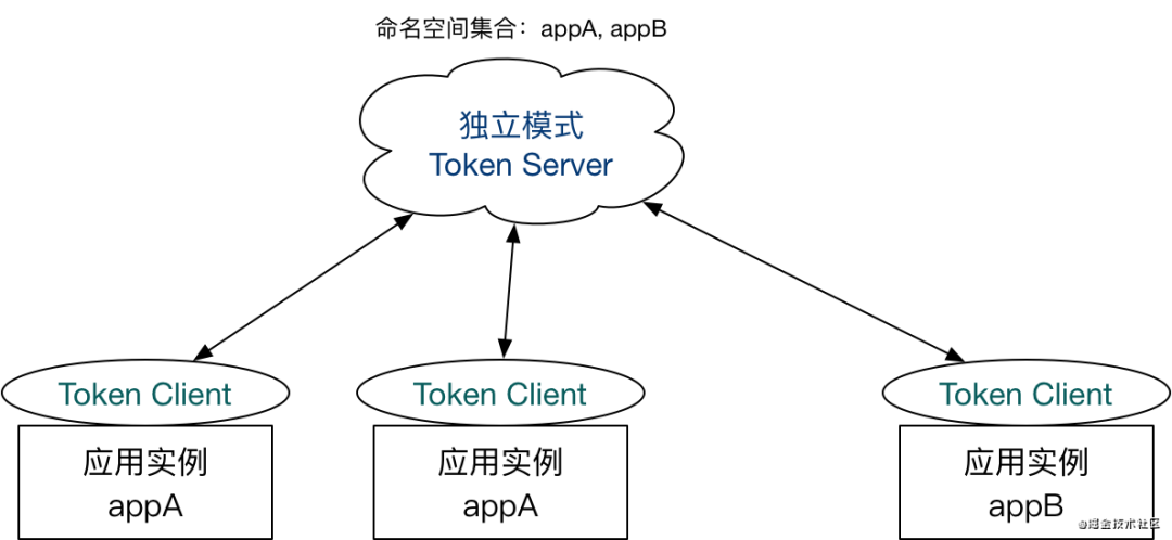 独立模式:限流服务作为单独的server进行部署,如下图所示,所有的应用都向单独部署的token-server进行获取token,这种模式适用于跨服务之间的全局限流,比如下面图中,A和B都会去token-server去拿,这个场景一般来说比较少,更多的还是服务内集群的限流比较多。