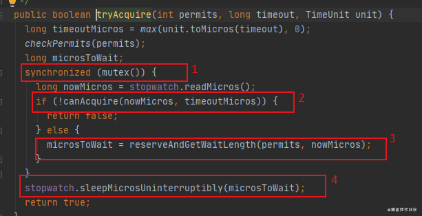 Step3: 申请令牌并获取等待时间,在我们tryAcquire中的timeout参数就是就是我们的最大等待时间,如果我们只是调用