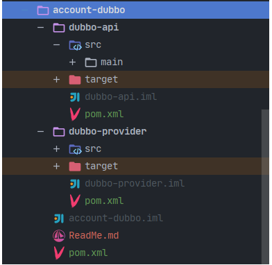 account-dubbo,在account-dubbo中再建立两个模块dubbo-api和dubbo-provider模块。 -