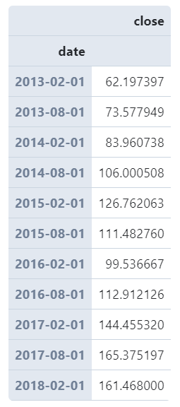 # 以6个月为统计窗口计算每月股票平均收盘价且显示为当月第一天