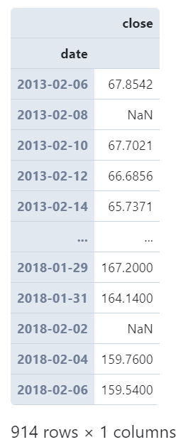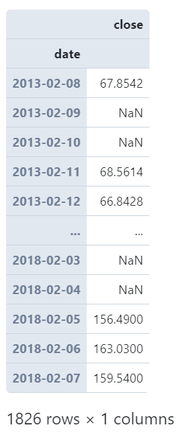 且resample()非常贴心之处在于它会自动帮你对齐到规整的时间单位上,譬如我们这里只有交易日才会有记录,如果我们设置的时间单位下无对应记录,也会为你保留带有缺失值记录的时间点: