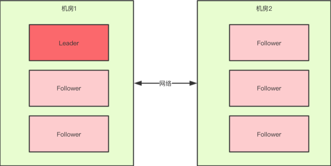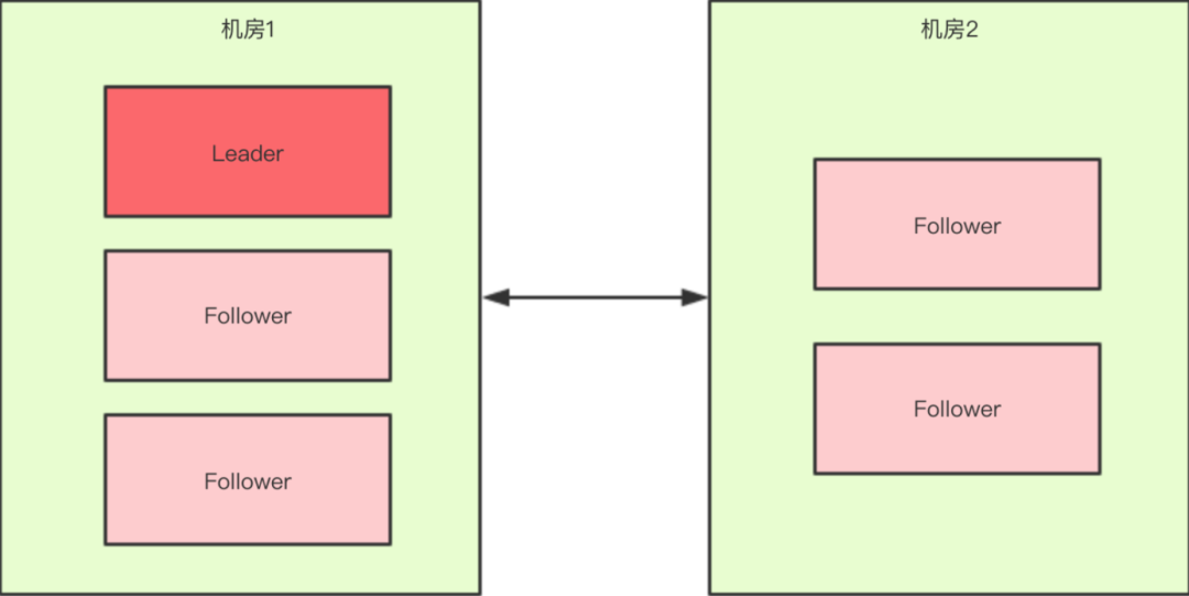 如果假设我们现在只有5台机器,也部署在两个机房: