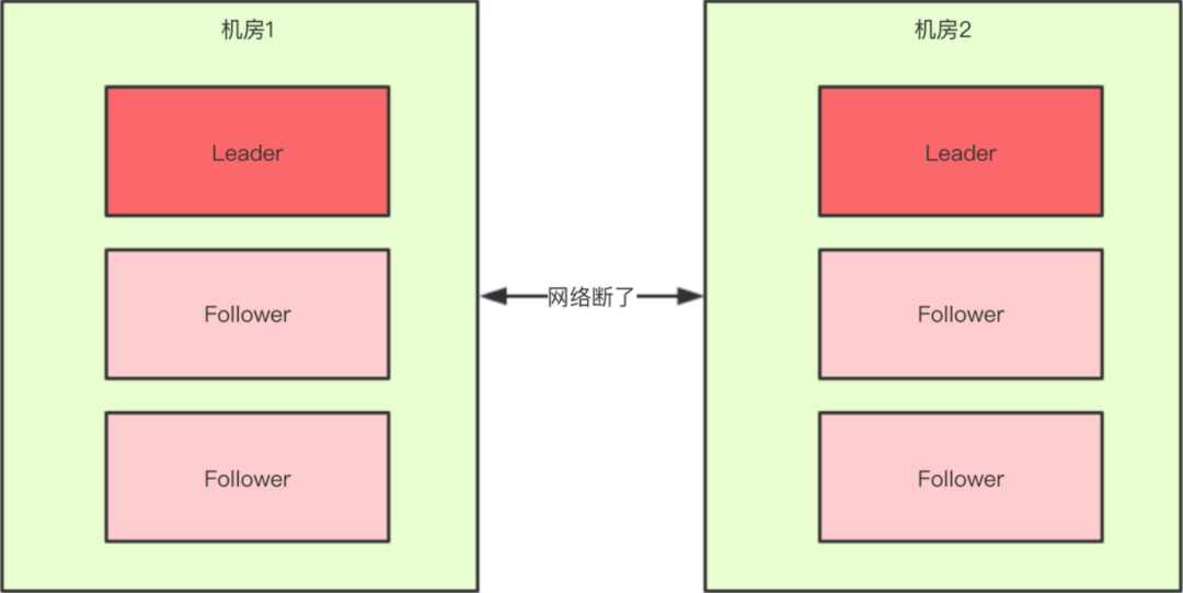 正常情况下,此集群只会有一个Leader,那么如果机房之间的网络断了之后,两个机房内的zkServer还是可以相互通信的,如果不考虑过半机制,那么就会出现每个机房内部都将选出一个Leader。