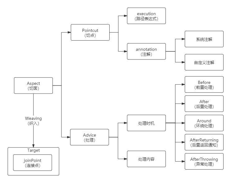 Advice:处理,包括处理时机和处理内容。处理内容就是要做什么事,比如校验权限和记录日志。处理时机就是在什么时机执行处理内容,分为前置处理(即业务代码执行前)、后置处理(业务代码执行后)等。 -