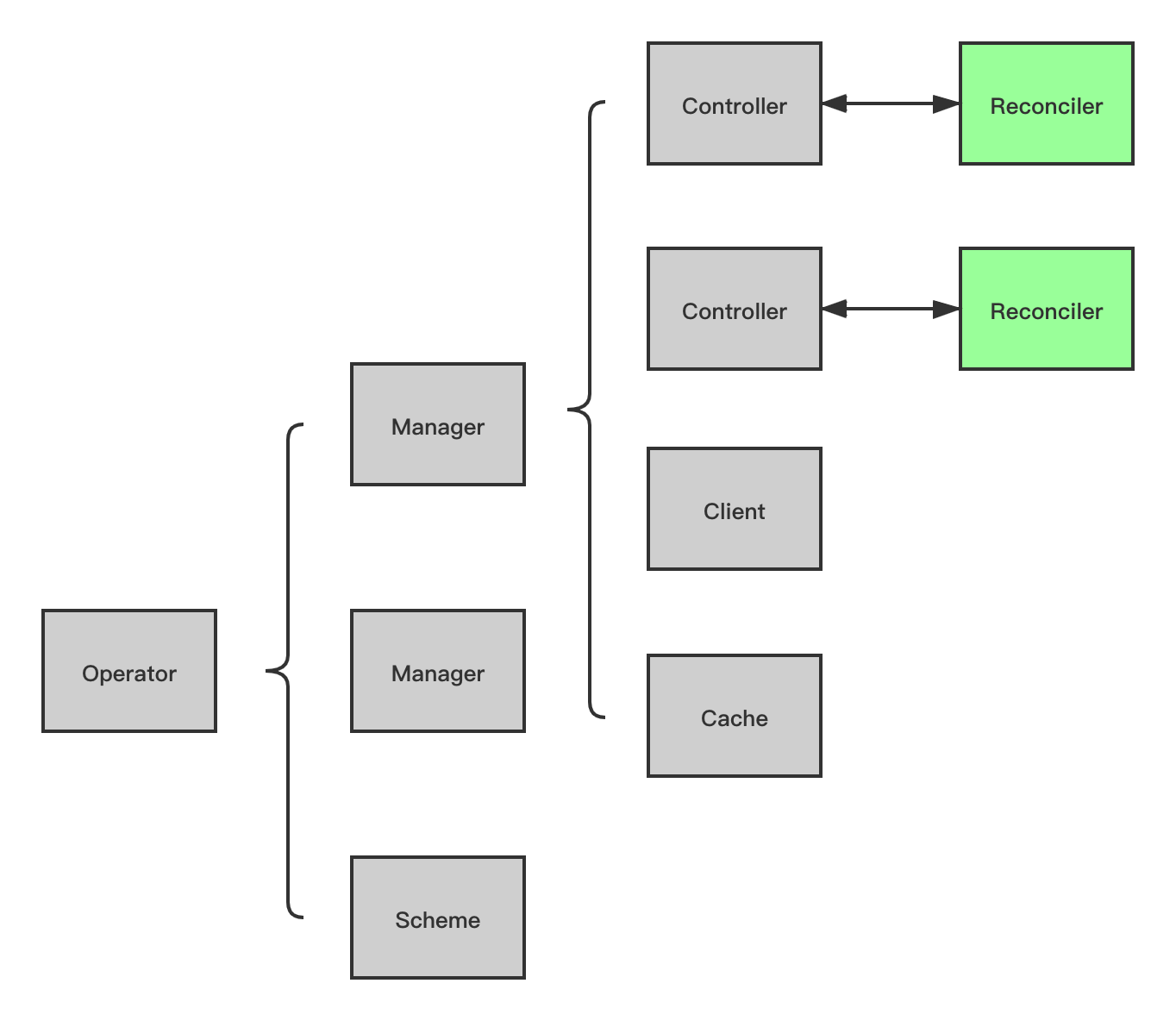 ├── Dockerfile├── Makefile├── PROJECT // Kubebuilder 自动生成的项目元数据├── README.md├── api│ └── v1beta1│ ├── groupversion_info.go // GV(GroupVersion) 定义以及 CRD 向 Scheme 注册的方法│ ├── myjob_types.go // 自定义 CRD 对应的 struct 的地方│ └── zz_generated.deepcopy.go // Kubebuilder 工具自动生成的 GVR DeepCopy的方法├── bin│ └── manager├── config│ ├── certmanager│ │ ├── certificate.yaml│ │ ├── kustomization.yaml│ │ └── kustomizeconfig.yaml│ ├── crd // 部署 CRD 的相关 Yaml 集合│ │ ├── bases│ │ │ └── myjob.github.com_myjobs.yaml│ │ ├── kustomization.yaml│ │ ├── kustomizeconfig.yaml│ │ └── patches│ │ ├── cainjection_in_myjobs.yaml│ │ └── webhook_in_myjobs.yaml│ ├── default // 使用 Kustomize 部署该 Operator 的一个默认 Yaml 集合,它以 crd,rbac,manager 为 base,具体的可以去学习 Kustomize 相关的用法│ │ ├── kustomization.yaml│ │ ├── manager_auth_proxy_patch.yaml│ │ ├── manager_webhook_patch.yaml│ │ └── webhookcainjection_patch.yaml│ ├── manager // 部署 Operator 的相关 Yaml 集合│ │ ├── kustomization.yaml│ │ └── manager.yaml│ ├── prometheus // Operator 运行监控相关的 Yaml 集合│ │ ├── kustomization.yaml│ │ └── monitor.yaml│ ├── rbac // Operator 部署需要的 RBAC 权限相关的 Yaml 集合│ │ ├── auth_proxy_client_clusterrole.yaml│ │ ├── auth_proxy_role.yaml│ │ ├── auth_proxy_role_binding.yaml│ │ ├── auth_proxy_service.yaml│ │ ├── kustomization.yaml│ │ ├── leader_election_role.yaml│ │ ├── leader_election_role_binding.yaml│ │ ├── myjob_editor_role.yaml│ │ ├── myjob_viewer_role.yaml│ │ ├── role.yaml│ │ └── role_binding.yaml│ ├── samples // 部署一个 CR 示例的 Yaml│ │ └── myjob_v1beta1_myjob.yaml│ └── webhook│ ├── kustomization.yaml│ ├── kustomizeconfig.yaml│ └── service.yaml├── controllers│ ├── myjob_controller.go // 开发者实现 Reconciler,完成控制逻辑的文件,对应上面原理图的 Reconciler│ ├── myjob_controller_test.go│ └── suite_test.go├── cover.out├── go.mod├── go.sum├── hack│ └── boilerplate.go.txt└── main.go // 该文件是 Kubebuilder 自动生成的,该文件里面会会对应上面原理图中的 Scheme 初始化,以及 Manager 的初始化,然后将 Reconciler 添加到 Manager 中