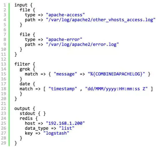 一个典型的Logstash的配置如下,包括了Input,filter的Output的设置。