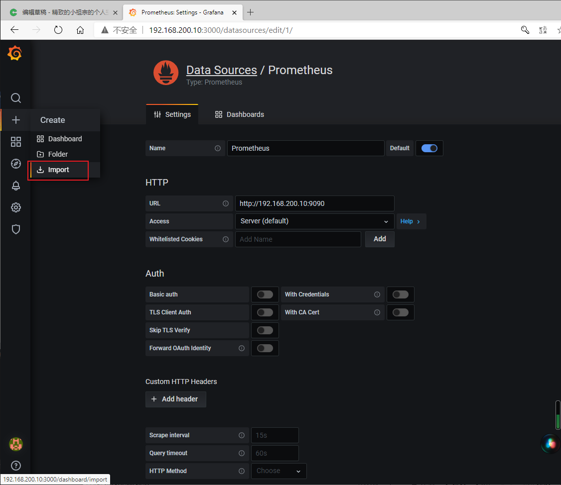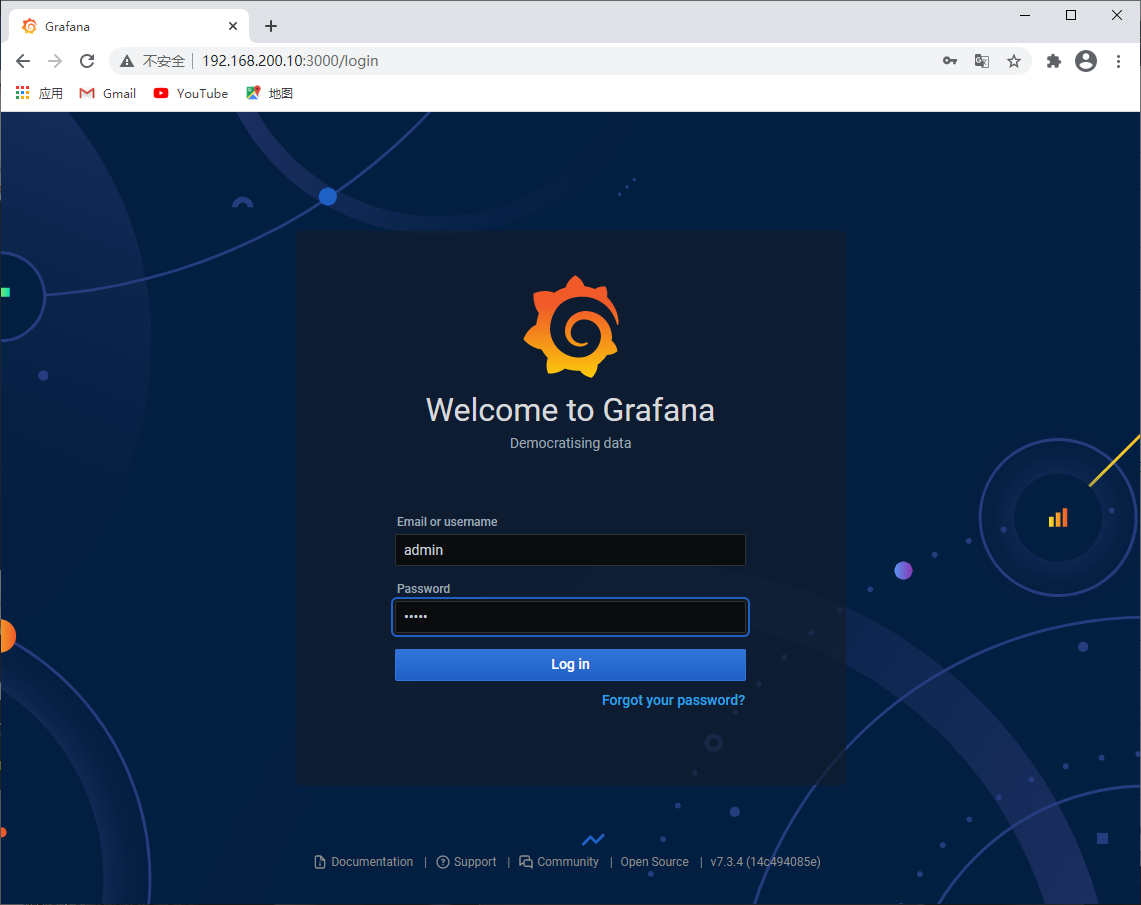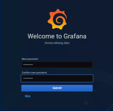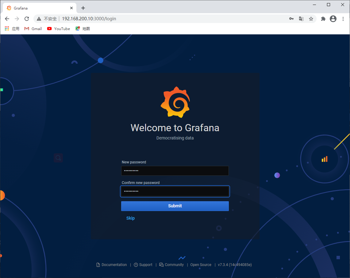 访问grafana,通过http://192.168.200.10:3000端口的方式访问,默认账号密码(admin/admin),首次陆续需要更新密码。