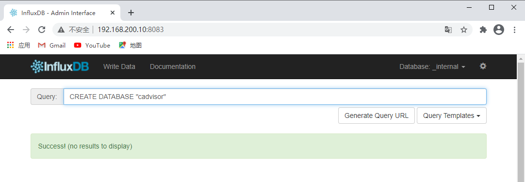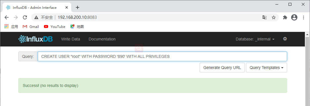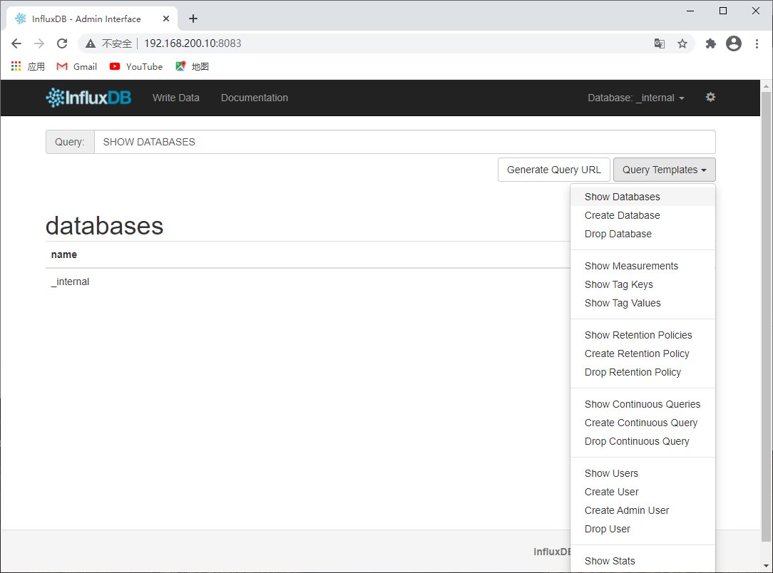 从上图可以看到,在Query Templates选项中提供了常用的操作模板,可根据这些模板来管理influxdb,下面我们就来创建数据库和数据库用户。